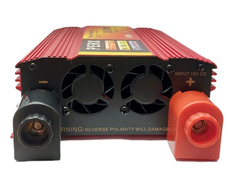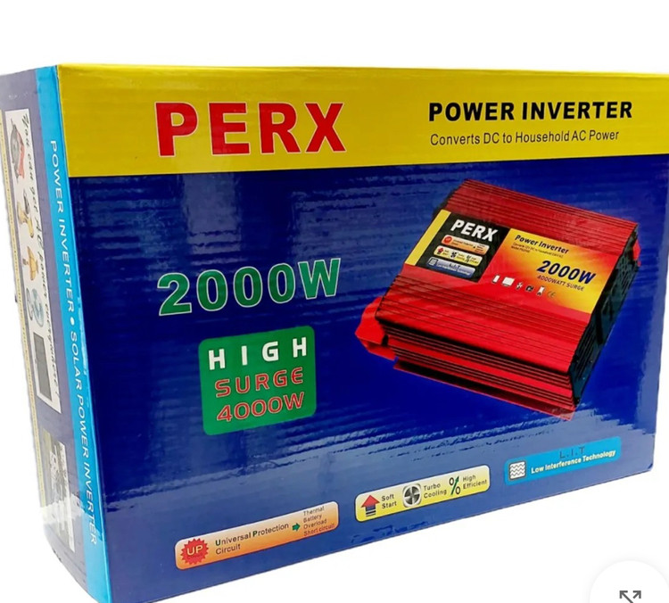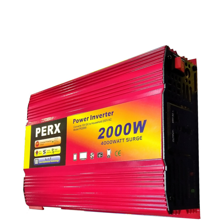 اینورتر برق خودرو 2500 وات برند PERX برای تبدیل ولتاژ ۱۲ولت خودرو به برق شهر 220 ولت با فرکانس 50 هرتز . قابلیت تامین 5000 وات به صورت لحظهای و تامین 2500 وات در حالت استفاده دایمی. طراحی منحصر به فرد و شیک با بدنه الومینیومی دارای توربو فن قدرتمندو هوشمند برای بهبود خنکسازی و افزایش راندمان. مجهز به 2پریز برق، مجهز به کابل اتصال به باتری، حفاظت در برابر اضافه بار و اضافه حرارت ، مجهز به هشداردهنده سطح ولتاژ پایین باتری، مجهز به قطع کننده اتوماتیک اینورتر از بار در صورت افزایش حرارت، مناسب برای سیستمهای روشنایی با هر نوع لامپ، سیستمهای گرمایشی، اتو، پنکه،کولر،سنگ فرز ،دریل بزرگ و هیلتی، تلویزیونهای LCD و LED ، لپتاپ، رایانه شخصی، موبایل و تبلت.